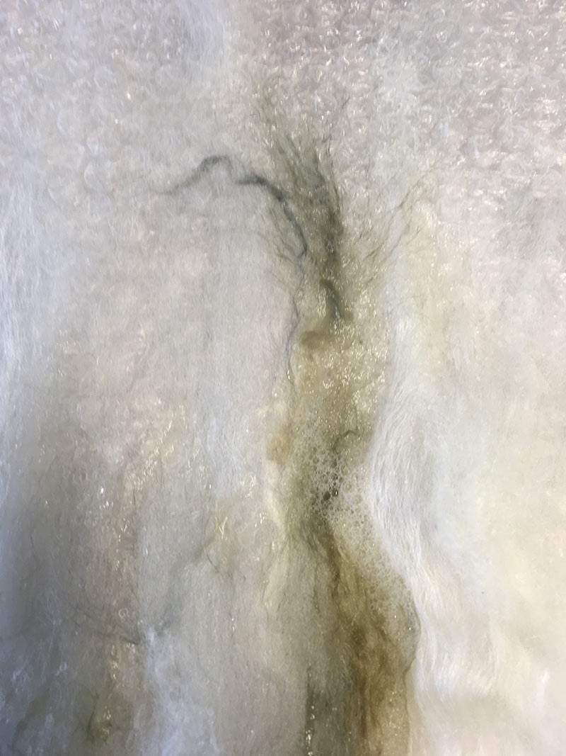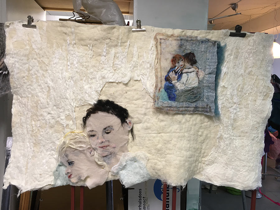 Vandaag heerlijk gewerkt in mijn atelier. Ik had nog behoefte aan “gras’. Heb dit nat gevilt van wol met zijde. Volgende week is het droog en kan ik het verwerken in het doek “Schatten”. Het doek groeit!