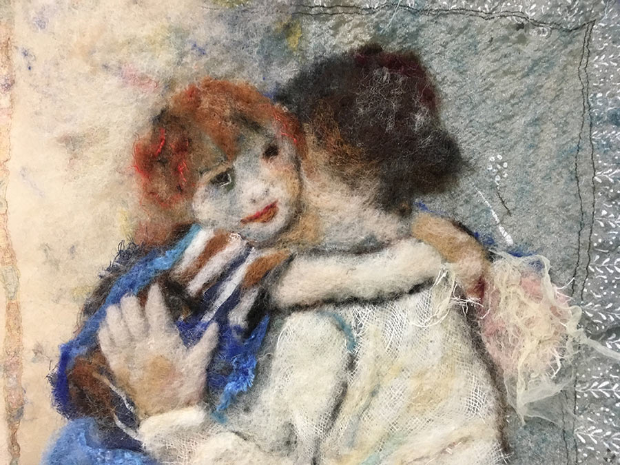Zo lekker aan het werk: mijn doek SCHATTEN begint vorm te krijgen. Hierbij 2 foto’s . Een is de tekening van Corstiaan de Vries, zoals hij maakte van mij met mijn dochter. Deze afbeelding komt uit zijn boek PORTRETTEN . De tekening is in werkelijkheid veel mooier. Foto nr. 2 is mijn textiele interpretatie van zijn tekening, zoals het er nu uit ziet. Nog niet af hoor!