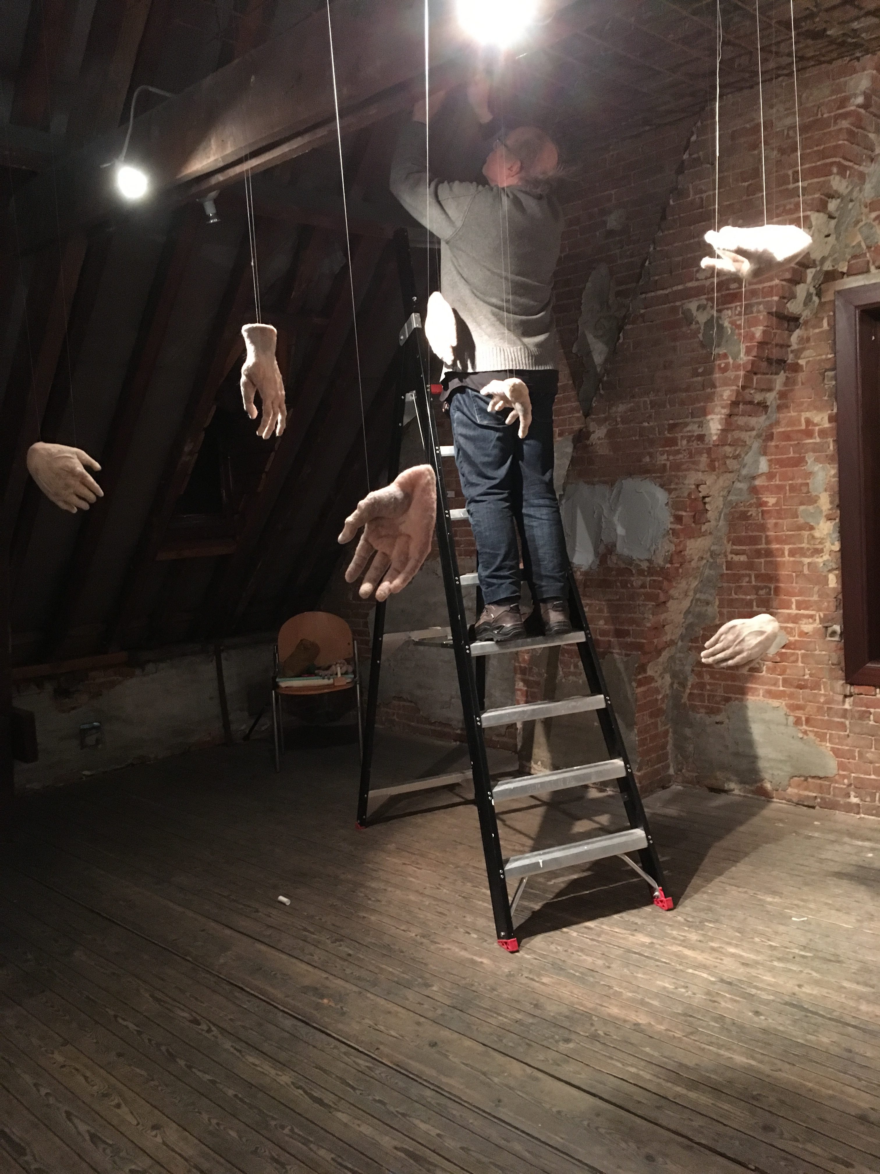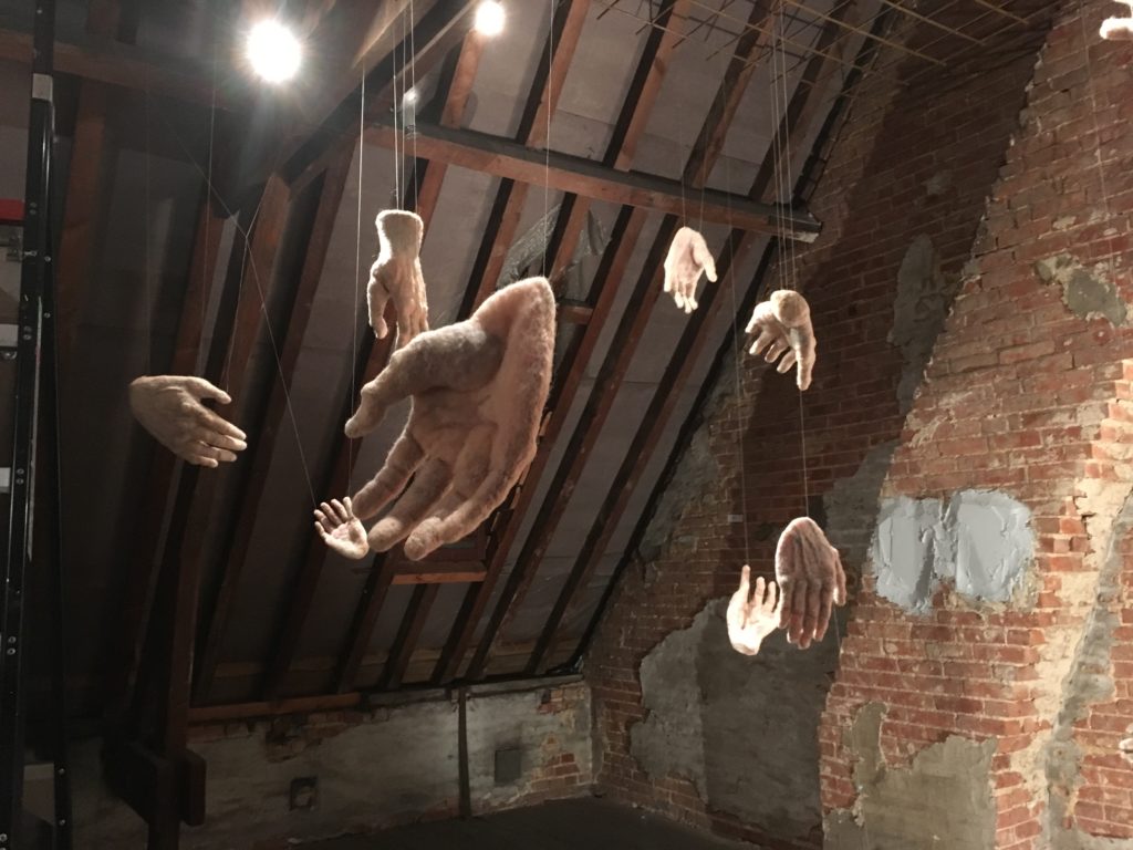 Nieuws Opbouwen installatie HULDE 13 december 2018 Mieke! Bijna klaar met het ophangen van de handen. Weer een hele klus. Het wordt prachtig. En ik ben trots om mee te doen aan deze bijzondere tentoonstelling in ’t Hofke van Chantraine in Oud-Turnhout in België.